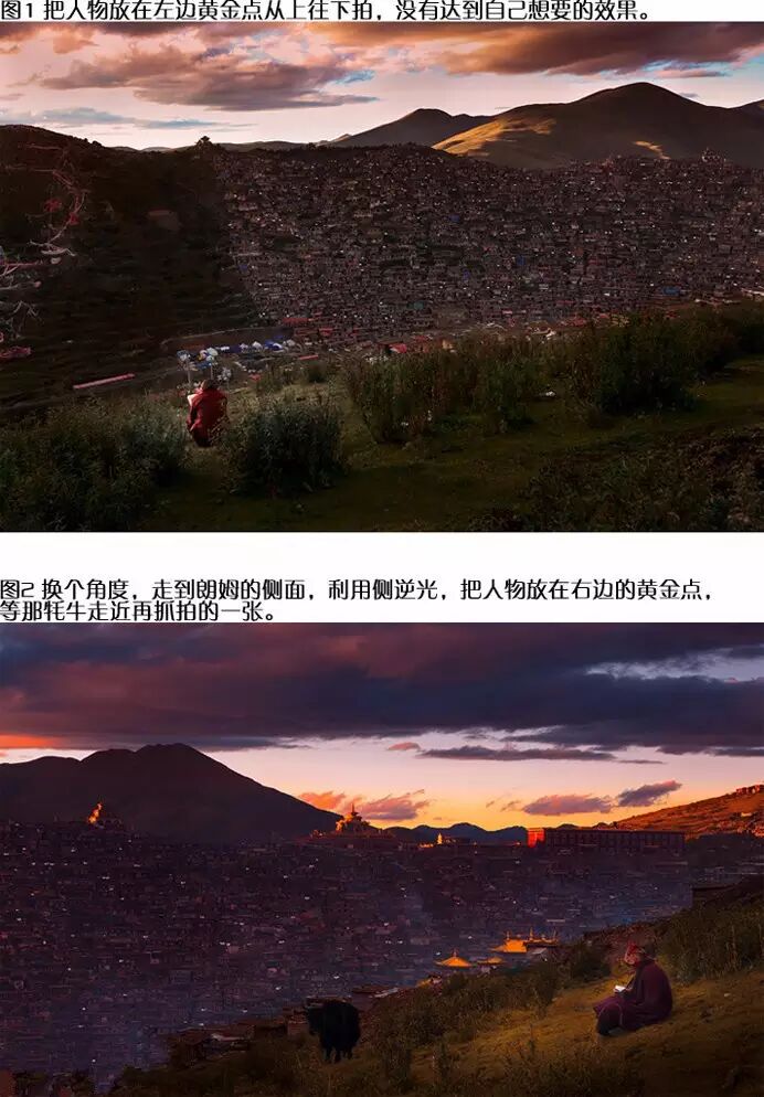 我站在色达金顶对面的山坡上准备拍摄色达的夕照全景,看见一朗姆正在坡下读经书,场景漂亮。第一张是把人物放在左边黄金点从上往下拍,感觉没有达到自己想要的效果。第二张换了个角度,走到朗姆的侧面,利用侧逆光,把人物放在右边的黄金点,等那牦牛走近再抓拍的一张。场景一样,拍摄角度不一样,最后的实际效果就不一样。