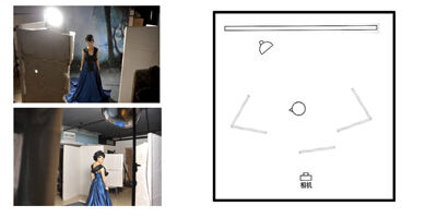 图1、光位图1-1、在人物面部方位的方向垂挂大面积的白色柔光布,在布的后面放置两至三盏硬光(也可以更多)组成光墙、光亮较强,做主光。在人物的后方、画面的右侧放置大块柔光布、柔光布的后面放置几盏柔光闪灯,这样双重柔光光质更柔、散、光的强度稍弱。