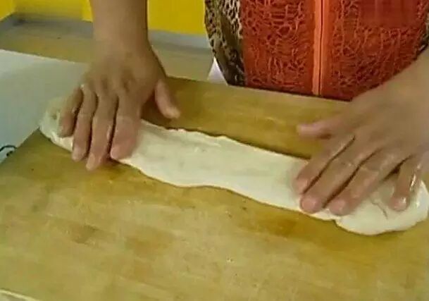 半小时后 把饧好的面拿出来放案子上揉揉 压成长条 在表面上刷一层油