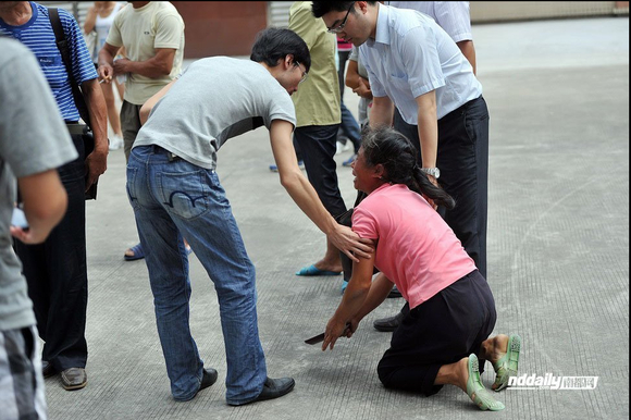 2012年8月6日,广东东莞,求职者吴艳春当街捅杀中介案开庭审理,吴艳春的母亲在法庭外跪倒在死者家属面前,不断地磕头认错,希望死者家属“放儿子一条生路”。