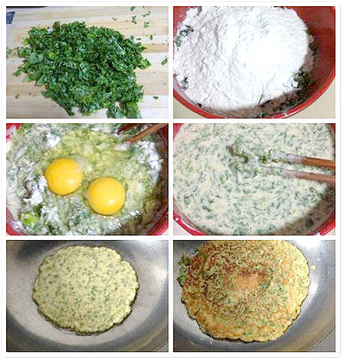 【食材】芹菜叶、面粉、鸡蛋、牛奶、油、盐、鸡精、胡椒粉。