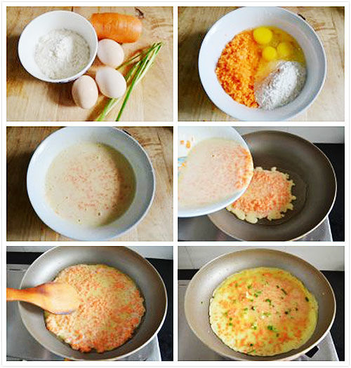 【食材】胡萝卜200克、鸡蛋2个、面粉50克、油、盐4克、葱。