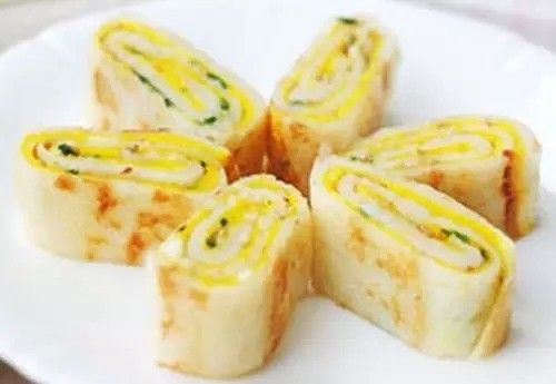 ③撒葱花、芝麻和肉松,待蛋液即将凝固的时候将饼卷起,卷起后小火再煎一下,待蛋卷上色成金黄即可切块装盘。