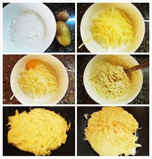 ①土豆洗净去皮切擦丝,放入面粉里;打入鸡蛋,用少量的水拌匀,加一点盐和黑胡椒碎调味;