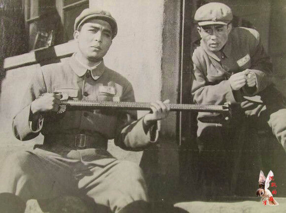 电影《铁道游击队》剧照。这个怀抱土琵琶弹唱的场面堪称红色电影里最为浪漫的镜头。