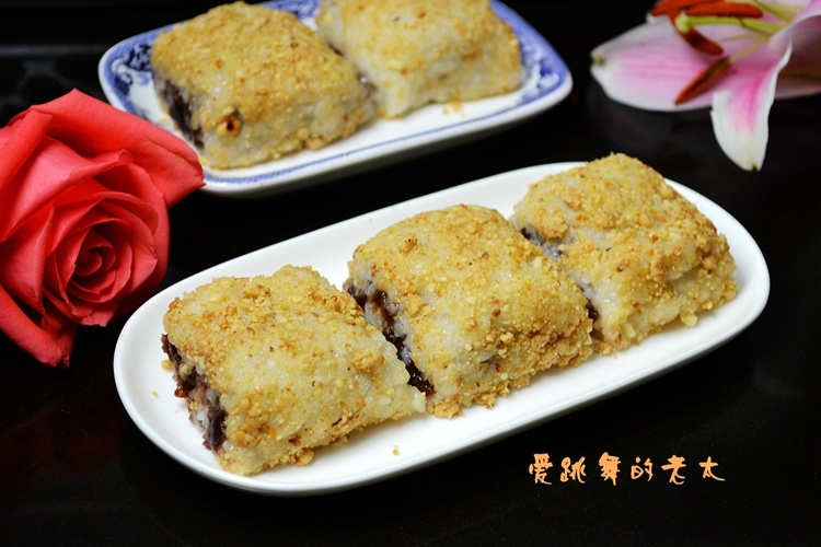 用料;糯米300克,豆沙120克,花生仁50克,芝麻15克.