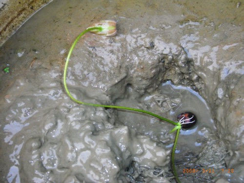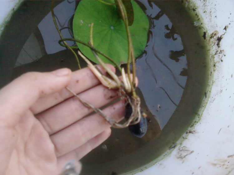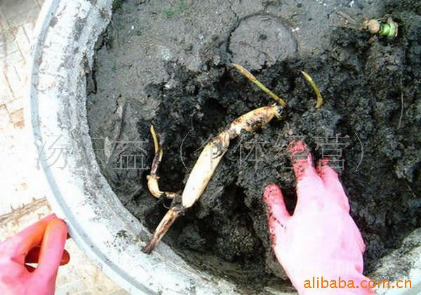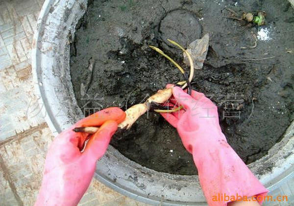 2、这样藕尾向上才正确,不用管芽的方向,它会自己调整生长位置的,主要控制藕尾,不使藕尾进水。