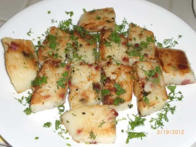 这锅很适合象我这样臂力不足的小女人,太重的提不起;这锅炒出的菜好吃,尤其是我的炉子也给力(Gas,17,200 BTU);这锅的缺点一是油烟大,不过,有我的三洋牌抽油烟机帮忙;二是连炒两个菜后手柄烫手,不过,相比于优点来说是瑕不掩瑜。。。。。。再来一盘煎好的萝卜糕;