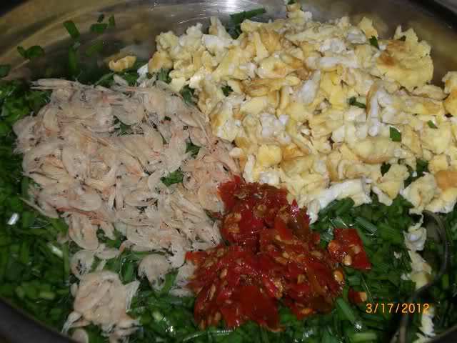 三杯中筋面粉,1杯半开水兑1/4杯凉水,面包机和面,待搅拌结束就可以了。韭菜洗净控干水分,切后浇入一大勺芝麻油拌一拌;三个鸡蛋加点盐打匀,待锅热油冒烟,倒入,用锅铲划开,再划开。。。关火,铲出,稍剁碎,放入韭菜盆中;再加两大勺虾皮;再加一大勺自己做的剁椒;先放一边,待用时再加盐调味拌好。
