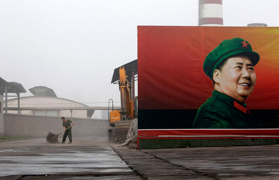 2012年9月25日,一位工人在南街村集团热力公司的毛泽东海报旁清扫街道。