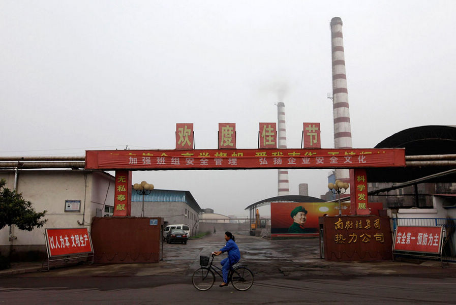 2012年9月25日,一位工人骑车从南街村集团热力公司门前经过。