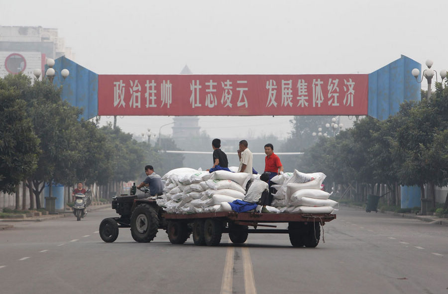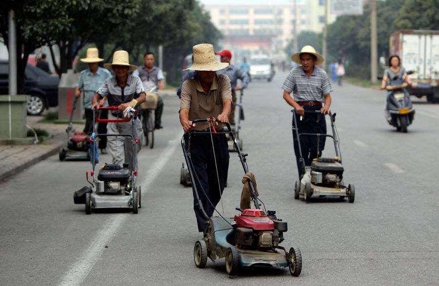 2012年9月24日,居民们在南街村的街道上推着割草机前行。