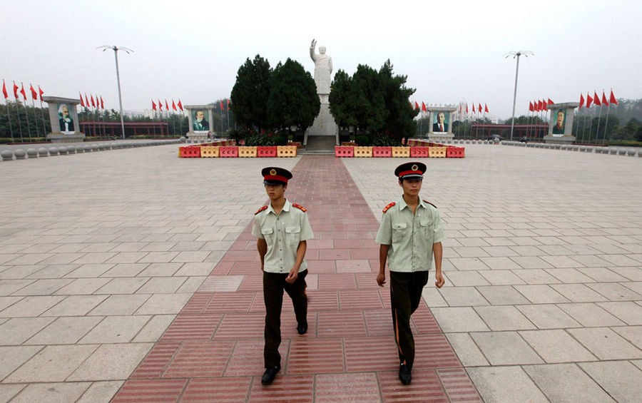 2012年9月24日,两个民兵在南街村东方红广场的毛泽东塑像两边站岗,图为他们结束了一天的站岗后撤岗离开。广场上的肖像,从左到右依次是卡尔马克思,弗里德里希恩格斯,弗拉迪米尔列宁和斯大林。