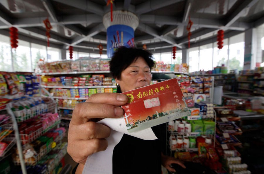 2012年9月25日,当地居民杨桂琴在南街村的一家商店中买水时,向我们展示她的南街村福利卡。
