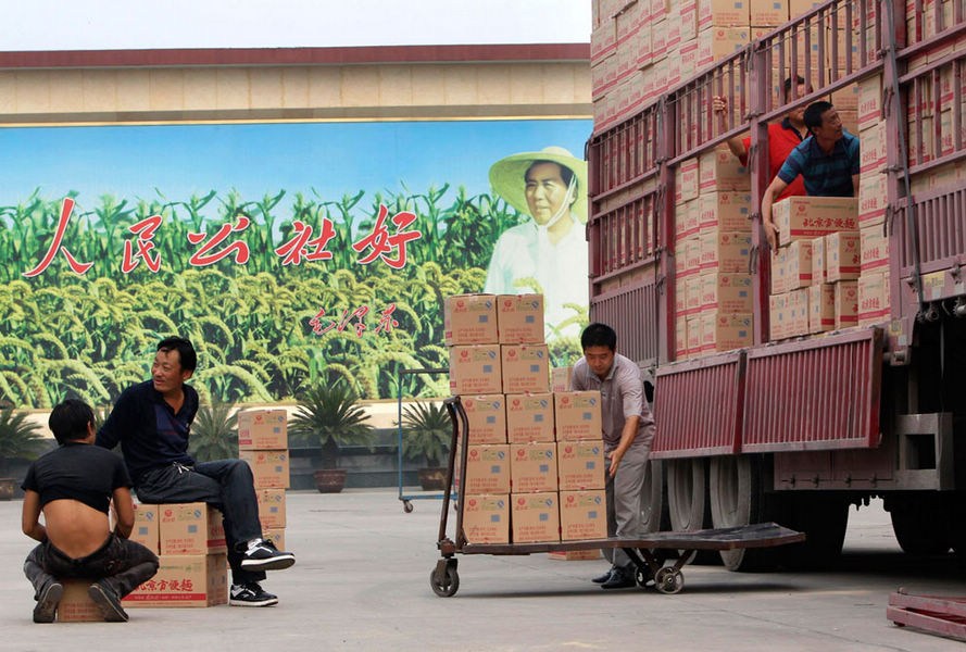 2012年9月24日,在南街村的一家方便面厂,工人们在向卡车上装箱。