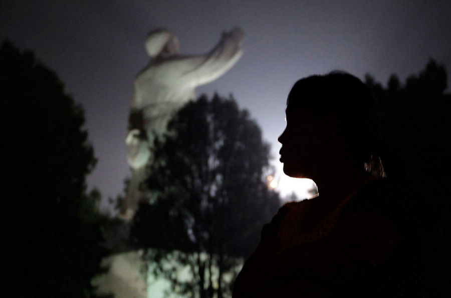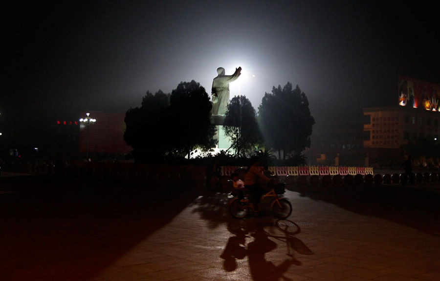 2012年9月24日晚上,中国中部河南省,一位居民骑车驮着孩子从南街村东方红广场上的毛泽东塑像旁经过。南街村被认为是中国最后一个共产主义村,在这里,毛泽东的道德标准和集体主义原则仍严格地指导着人们的日常生活。毛主席仍然被人们高度崇拜,拥有着神一般的地位。