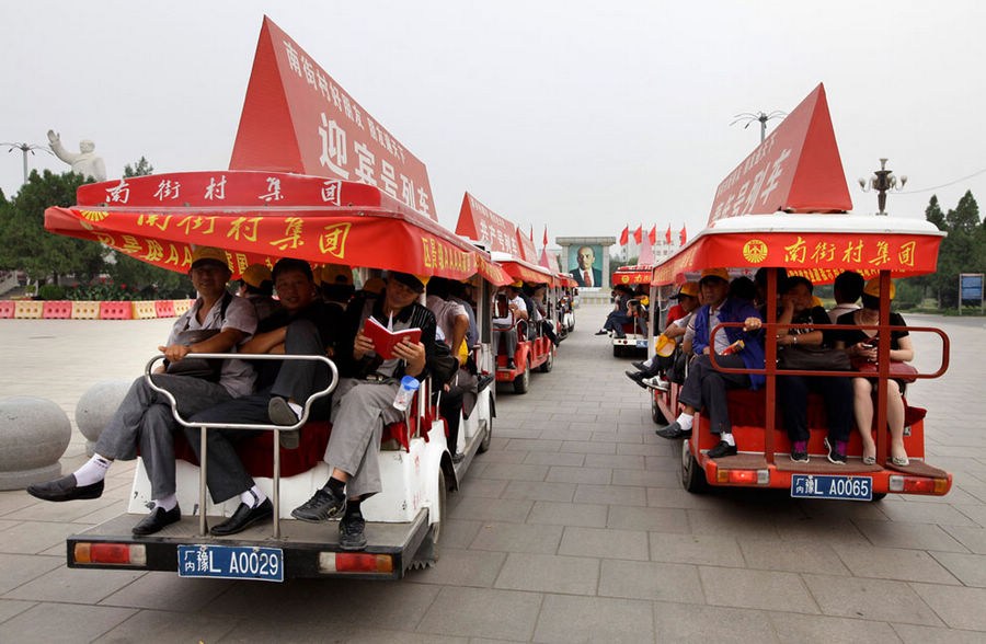 2012年9月25日,旅游车将游客运送到南街村东方红广场上的列宁肖像旁。