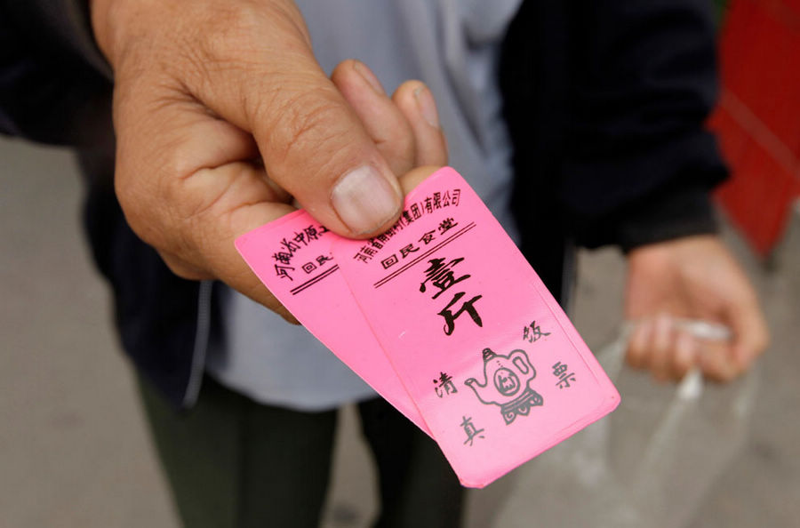 2012年9月25日,一位居民出示饭票领馒头。