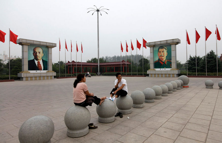 2012年9月24日,两个居民在南街村东方红广场上休息,他们身旁是列宁和斯大林的肖像。