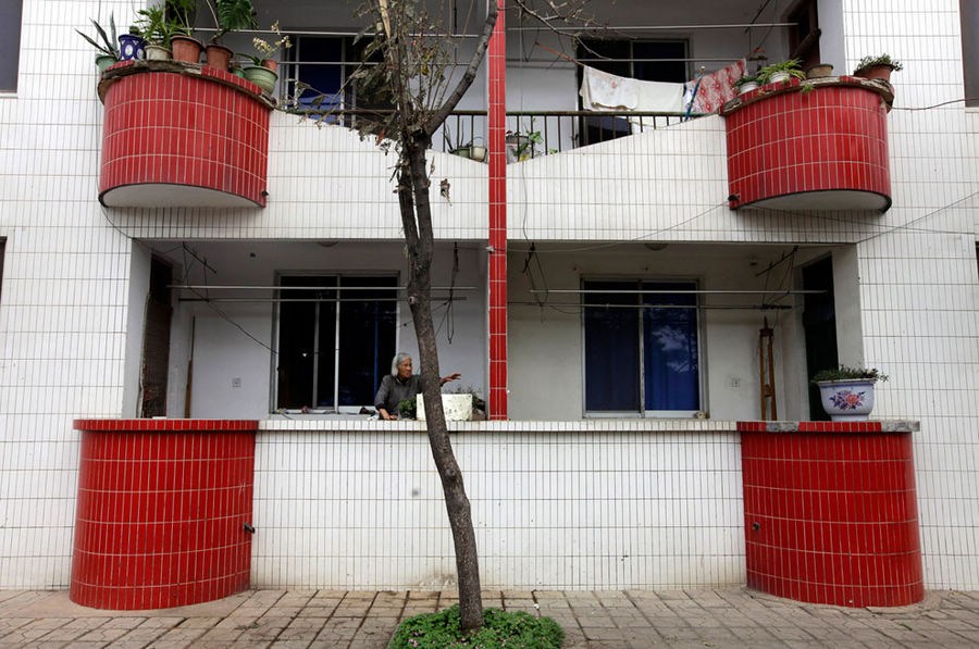 2012年9月24日,南街村社区,一位居民在自家福利房的阳台上拿东西。