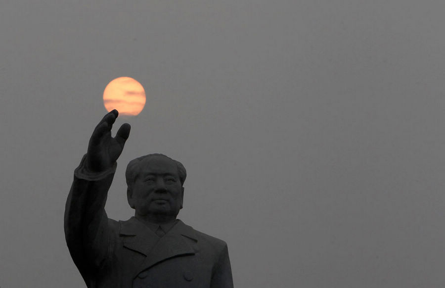 2012年9月25日,中国中部河南省,一尊毛主席雕像矗立在南街村的东方红广场上。