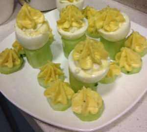 5、黄瓜装入盘中,舀适量蛋白铺在表面。