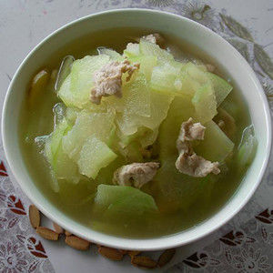 准备食材:冬瓜1块、猪肉450克、赤小豆100克、蜜枣4个、食盐少许、陈皮1小块。