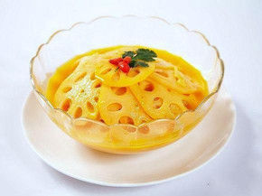 1、将藕去皮切薄片,用a料(橙汁粉、白糖适量、冷开水)调好橙汁,放进藕片浸泡几小时入味。