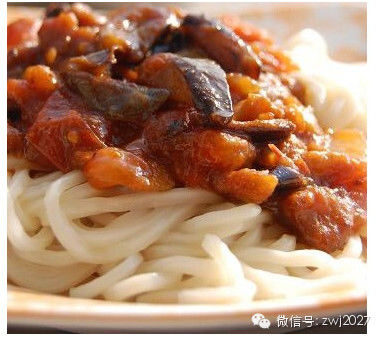 4、加入茄子和青椒,炒匀盛出,浇在面条上食用。