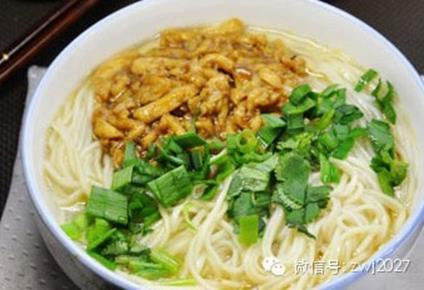 5、面滚开三次后,捞出,调入一点盐、舀入热面汤,将炒好的鸡肉放在面上,再撒上香菜和蒜苗,淋点香油,即可。