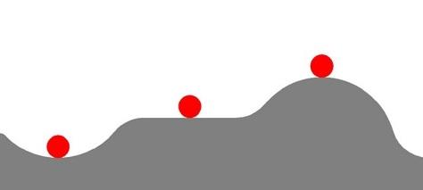 这三个小球是三种「平衡」的状态。左边这个小球是「稳定」的,如果它被挪动一定距离,只要这段距离不是太远,它都能恢复原状。中间这个小球无所谓稳定不稳定,如果它被挪动一定距离,它可以在新的地方安居乐业。右边的这个小球是「不稳定」的,哪怕稍微轻轻的碰一下,它也会一路滑落,再也回不到最初的地方。