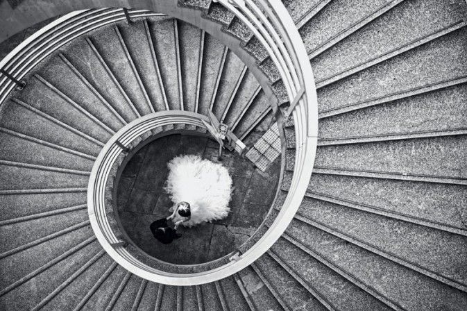 螺旋状引导线构图虽然很常见,但这种构图方法的视觉效果的确很好。而这幅作品的特殊之处在于,栏杆是一种螺旋状的引导,而楼梯本身则是一种发散状的线性引导,充满了几何的韵味和美感,而最下面的新郎新娘又为作品增色几分。这张照片并没有表现出什么深刻的主题,但构图如此优美,毫无疑问也是一张好照片。